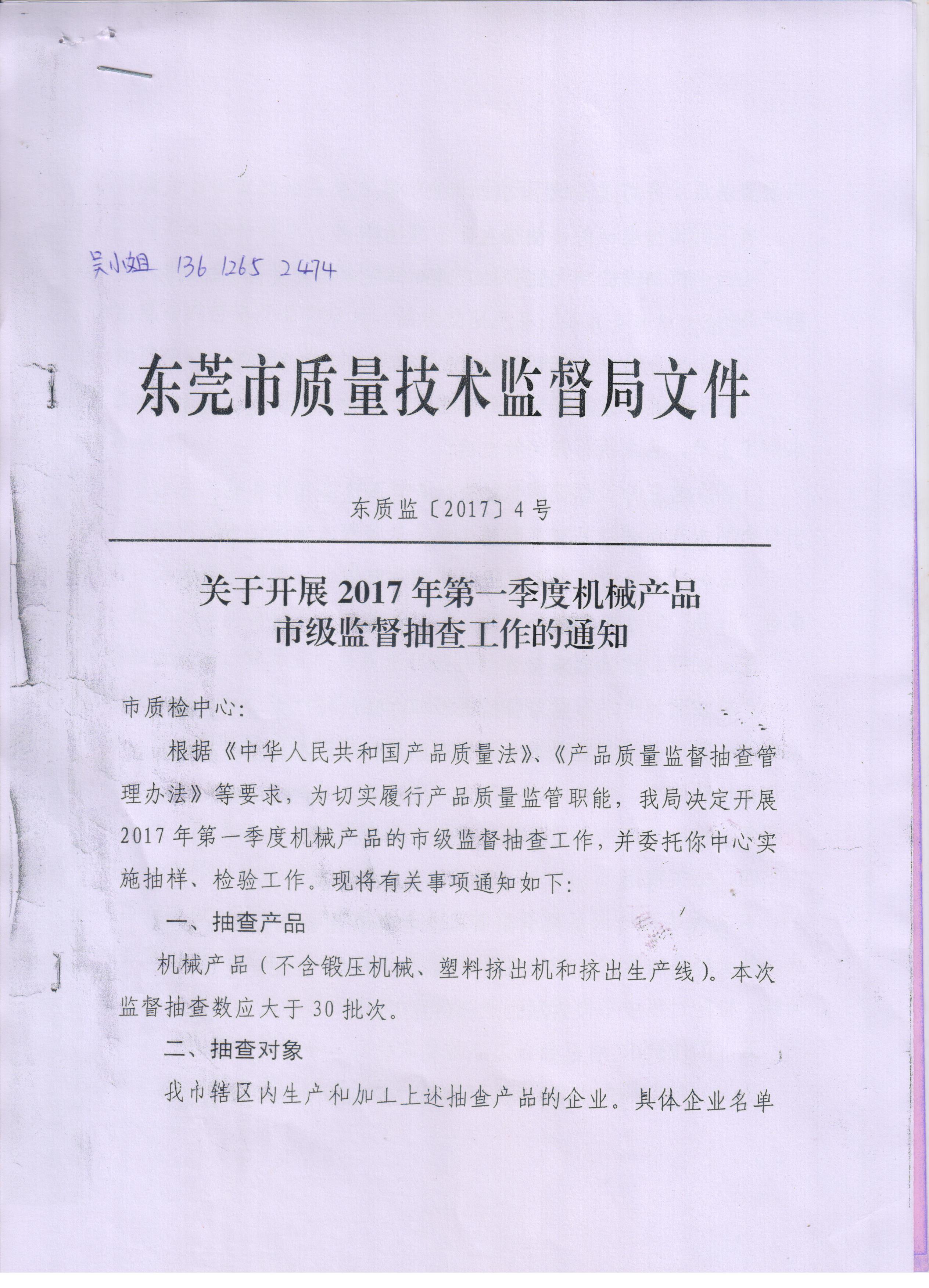 東莞市質(zhì)量技術(shù)監(jiān)督局抽查浩能機(jī)械手,
