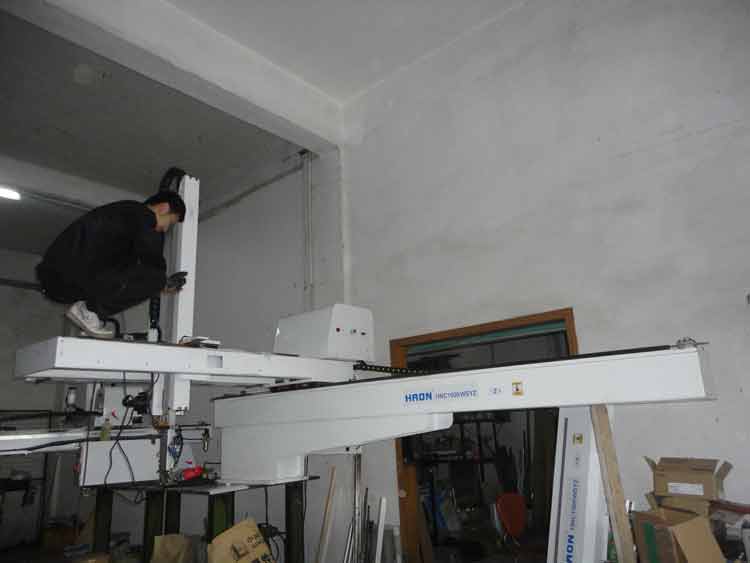 這臺(tái)注塑機(jī)是1600噸,配1900或者2000的機(jī)械手型號(hào),安裝后高度太高,只能仰望了、、、